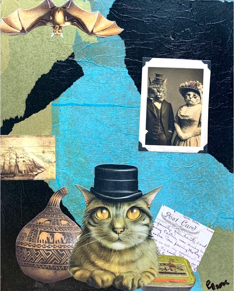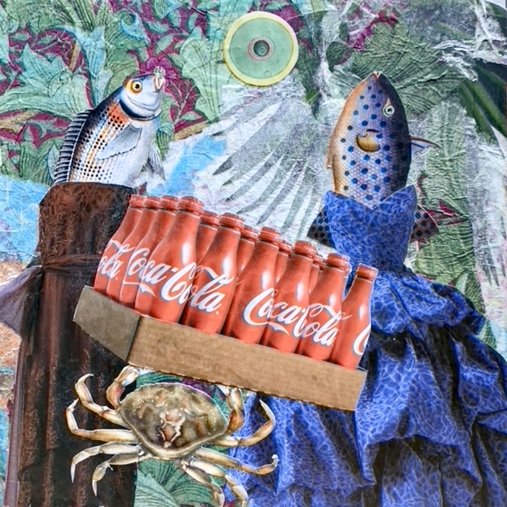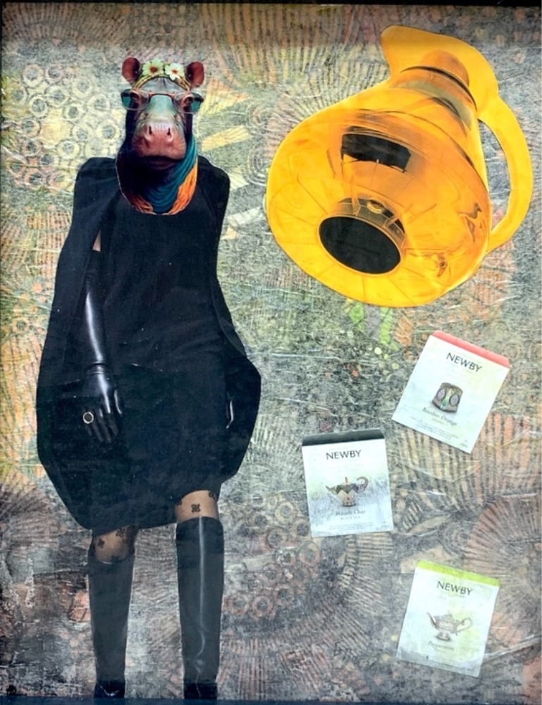 Now, her art blends whimsy, creativity, and vibrant colours, radiating happiness and fun. It embraces traditional elements with a quirky twist, creating a modern vintage aesthetic that captivates her audience and brings them to her art shows. Her collages are full of positive energy, fun and make everyone smile.