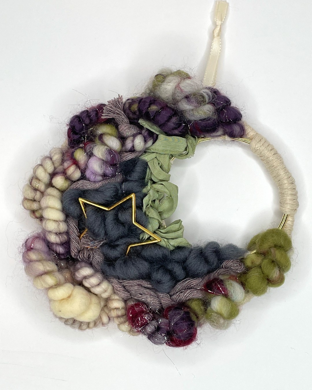 The use of materials in her work is intentional. Jackie selects wool and other natural fibres for their structure, feel and appearance. She starts with the selection of the handspun art yarn that will influence the colour palette and feel of the finished piece. Additional materials are chosen to add contrast and texture. She likes to introduce material and colour combinations that are unexpected yet pleasing to the eye.
