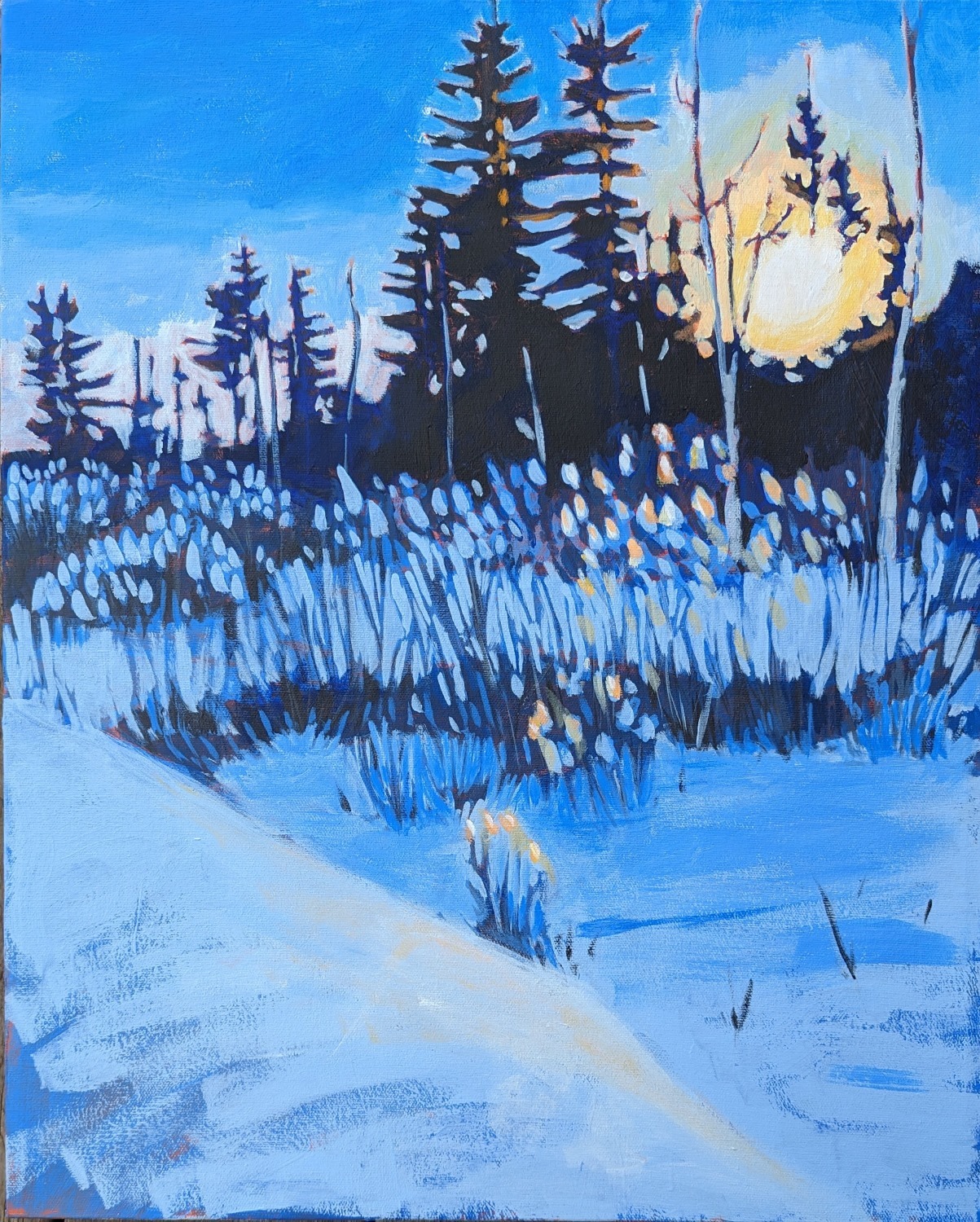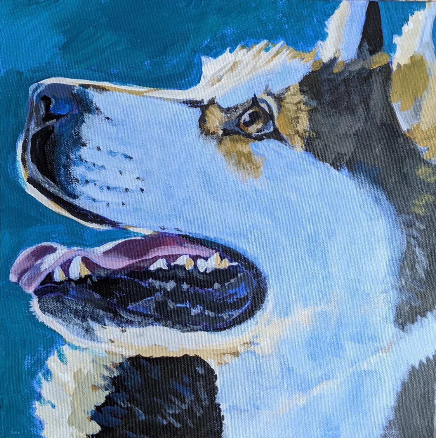 Jane has learnt from local professional artists, such as Adrian Baker, and many online programs such as Will Kemp art and Acrylic University. She loves bright colours and uses them to portray emotions. She feels that each season has a unique mood and paints each season as it occurs, surrounding herself with images of the daily hikes she takes with her dog.