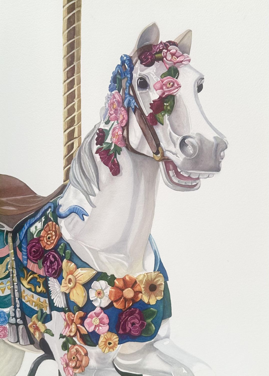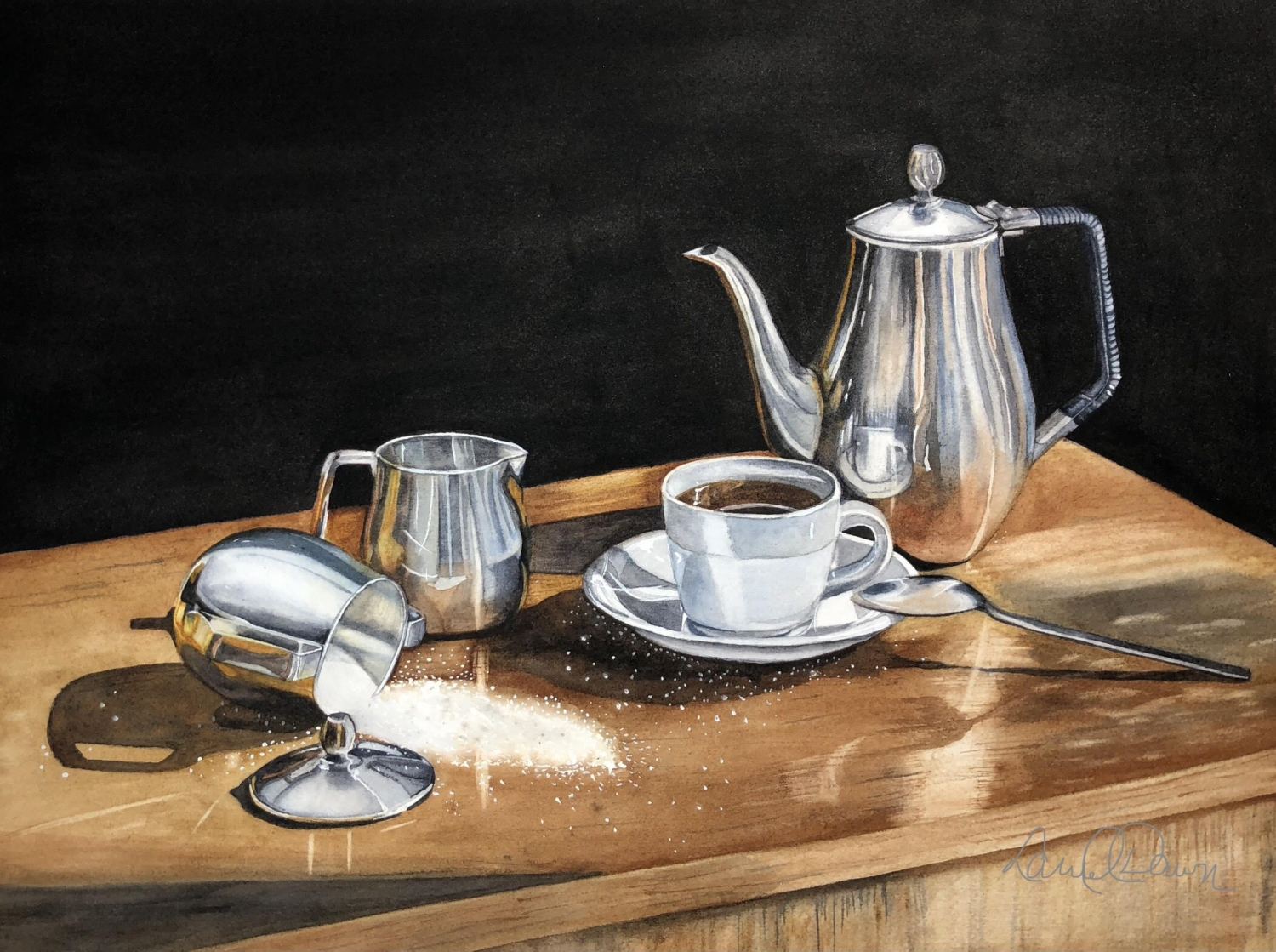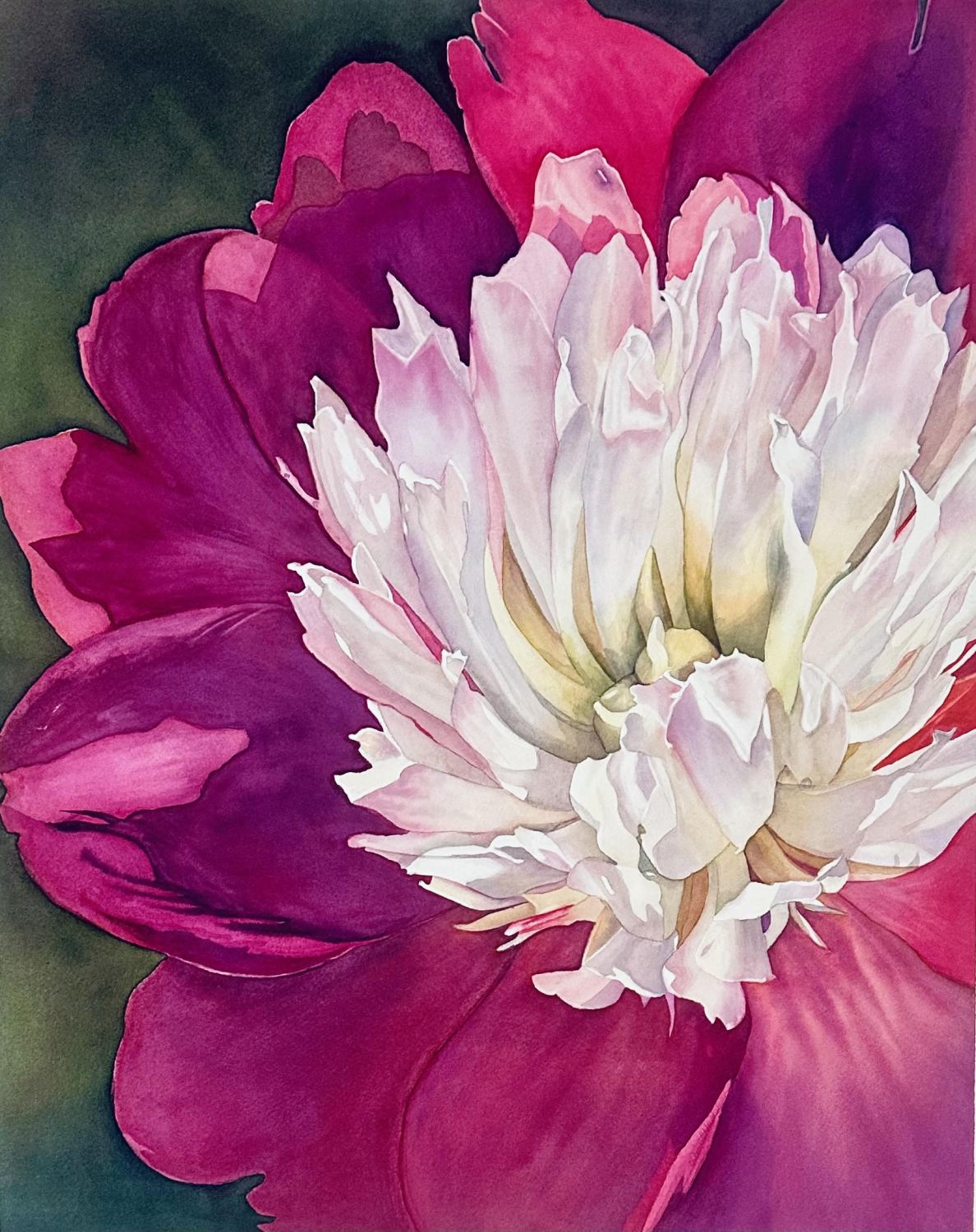 Contemplating retirement in 2019 she considered returning to oil painting but didn’t want to fuss with the solvents necessary for cleaning. A co-worker dabbled in watercolour and she loved the transparency and lightness that could be achieved so decided to explore this medium.