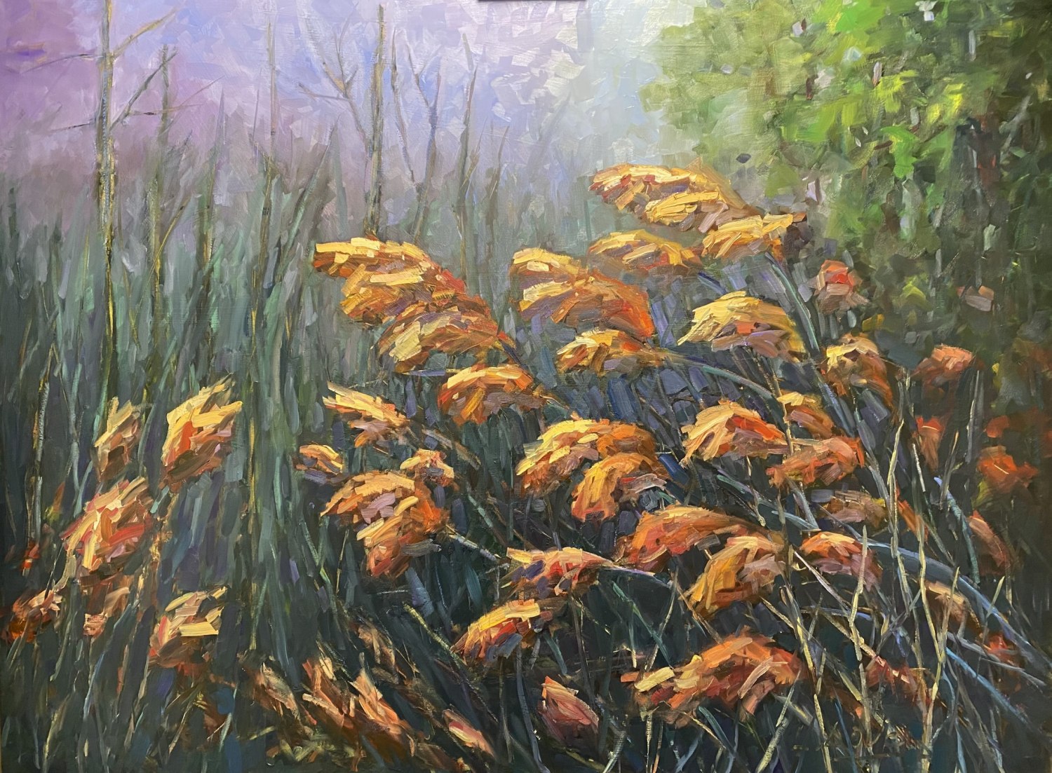 Painting primarily in oils, Linda also experiments with acrylics, watercolours, and alcohol inks, showcasing her versatility and openness to new techniques. Her artistic process is meticulous yet inspired, beginning with photographs that capture moments of natural beauty. She then thoughtfully composes her pieces, emphasizing bold colors, textured impasto strokes, and a dynamic interplay of light and shadow.