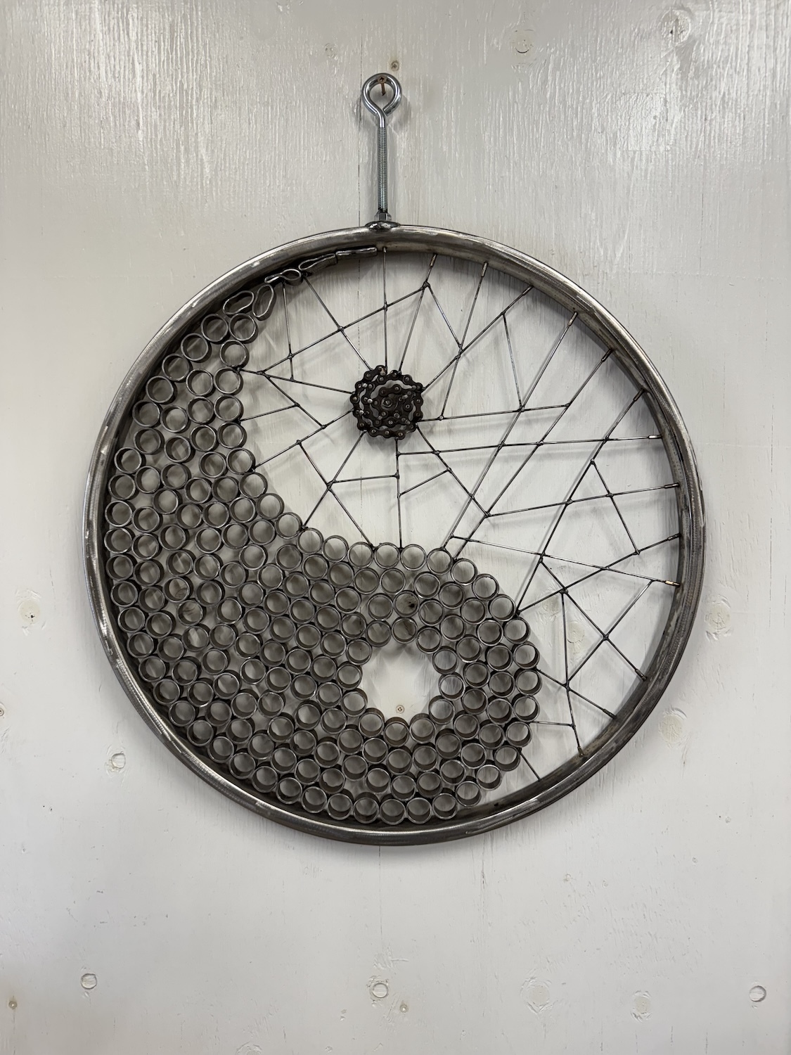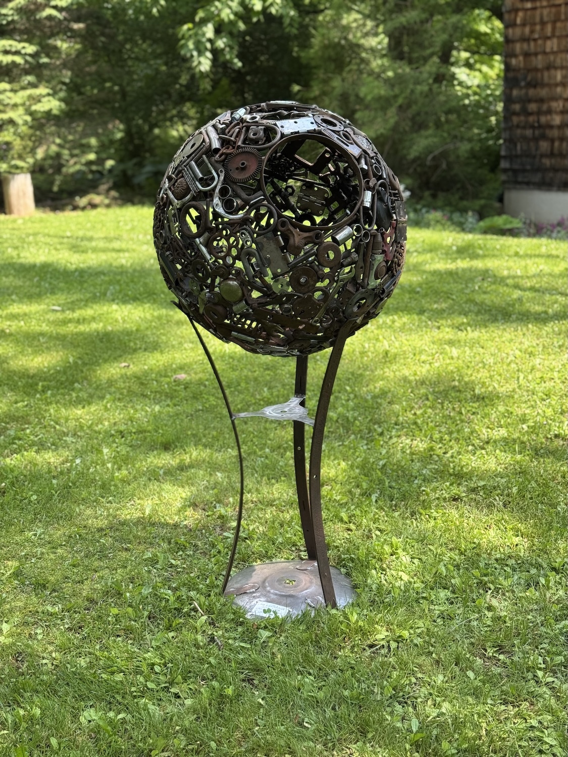 Potvin transforms scrap metal into sculptures ranging from simple forms such as globes and circles to stylized animals and birds. Her process begins with scavenging for century old equipment, tools, cutlery, automotive scraps and unique decorative metal objects from flea markets, antique shops and charity stores.