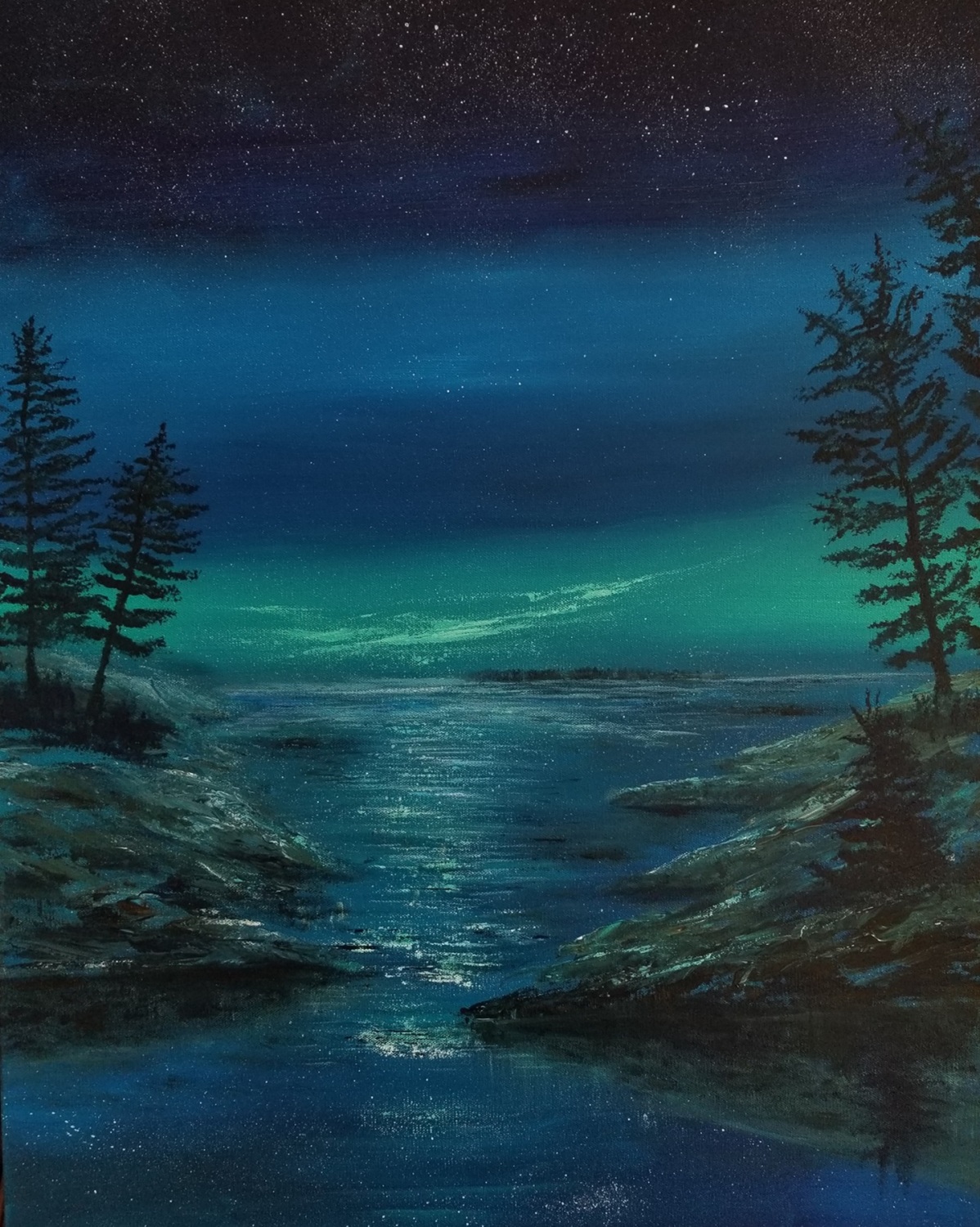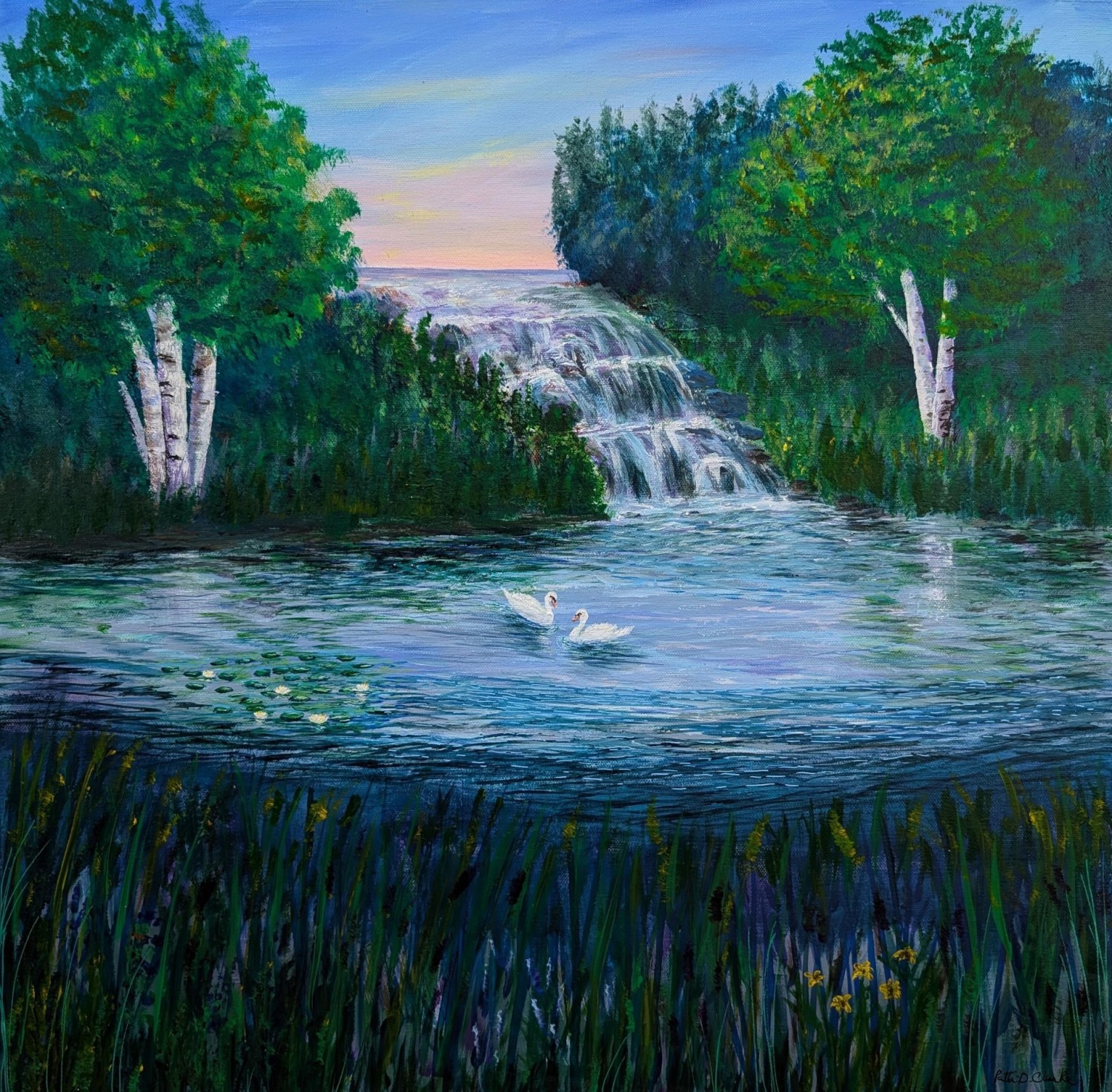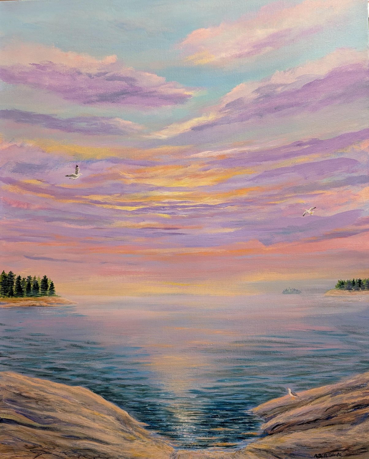 Patti was a primary teacher for over thirty years and is now semi-retired, teaching Kindergarten part-time and enjoying family life and painting. She is self-taught and enjoys expressing her love of creation through acrylic painting. She especially loves to capture the light in the sky and water. Patti has been painting all her life but has been able to focus much more time on painting in recent years, practicing water and skyscapes. She hopes to share the peace that she feels with others through her art.