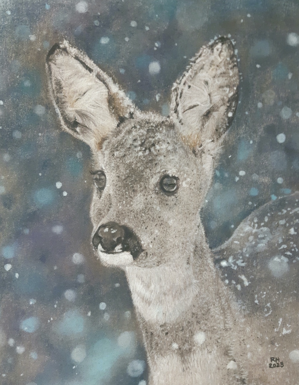 After graduating from Sheridan College from both the Art Fundamentals and Classical Animation programs, she has worked as a professional artist for 23 years, exploring both digital and fine arts. She now primarily uses watercolours, acrylics, chalk pastels, and materials she finds in nature to create art. Her focus is on realism, although she enjoys exploring the impressionistic whimsy of her multi-media pieces. She recently moved to the Smiths Falls area and was the winner of the 2023 Rideau Artist of the Year competition.