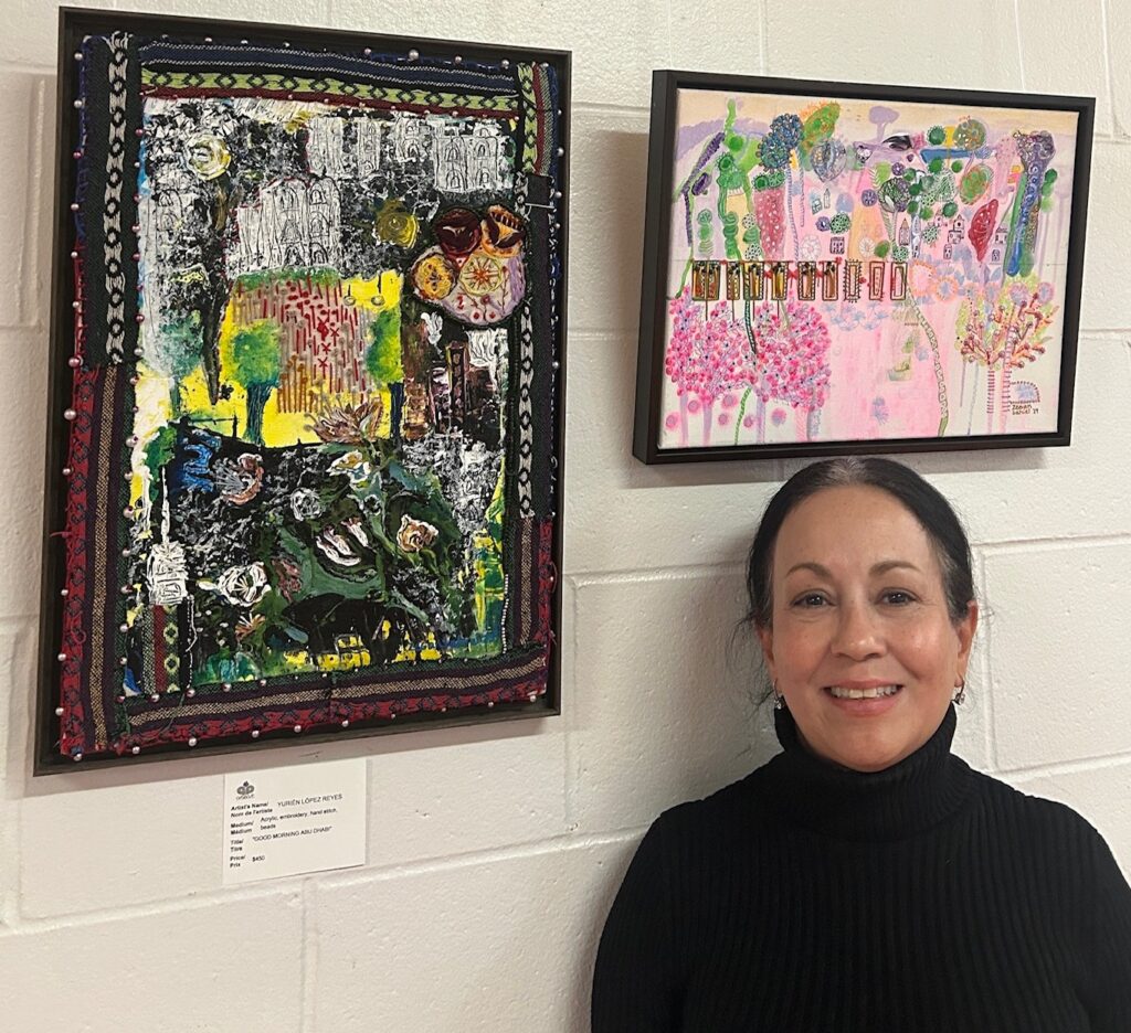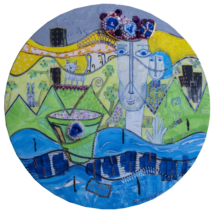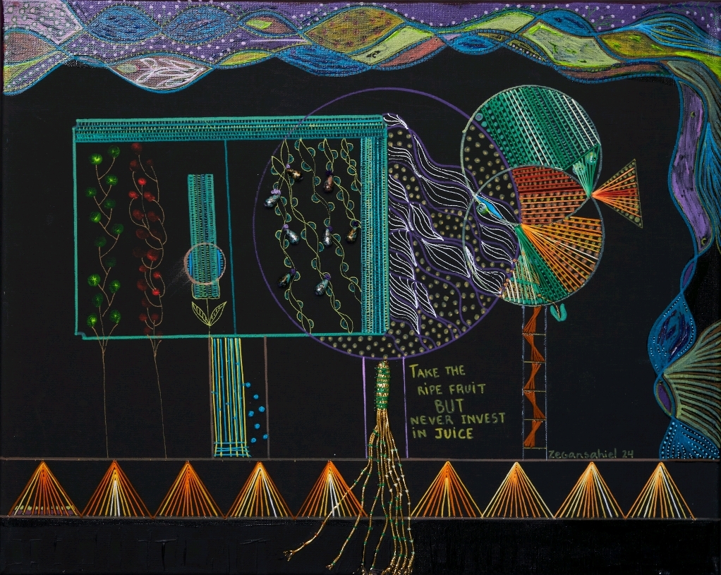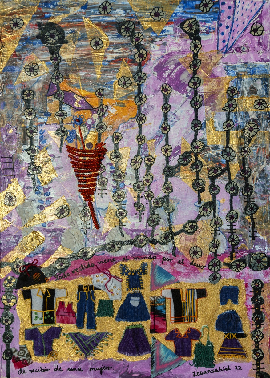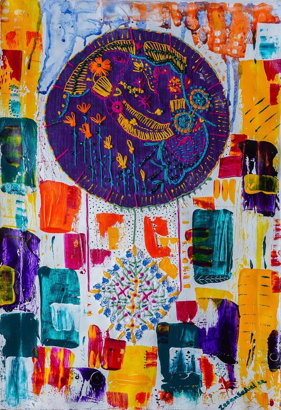 Yurién López Reyes is a multimedia artist from Trinidad, Cuba who paints under the professional name “zegansahiel”.  Working primarily in acrylic and gel pen canvases, her art often incorporates embroidery, hand stitch, fabric and beads, as well as other 3D elements and text to bring intriguing textural and material effects to the colour harmonies of her pieces.