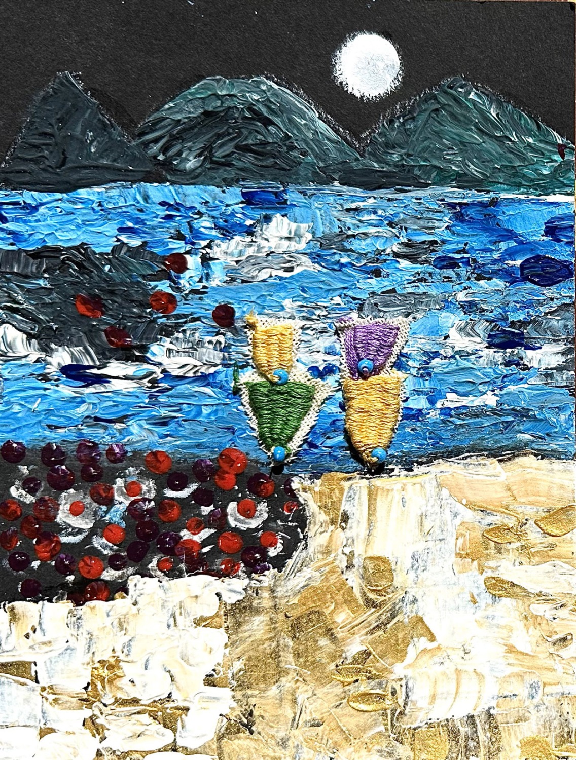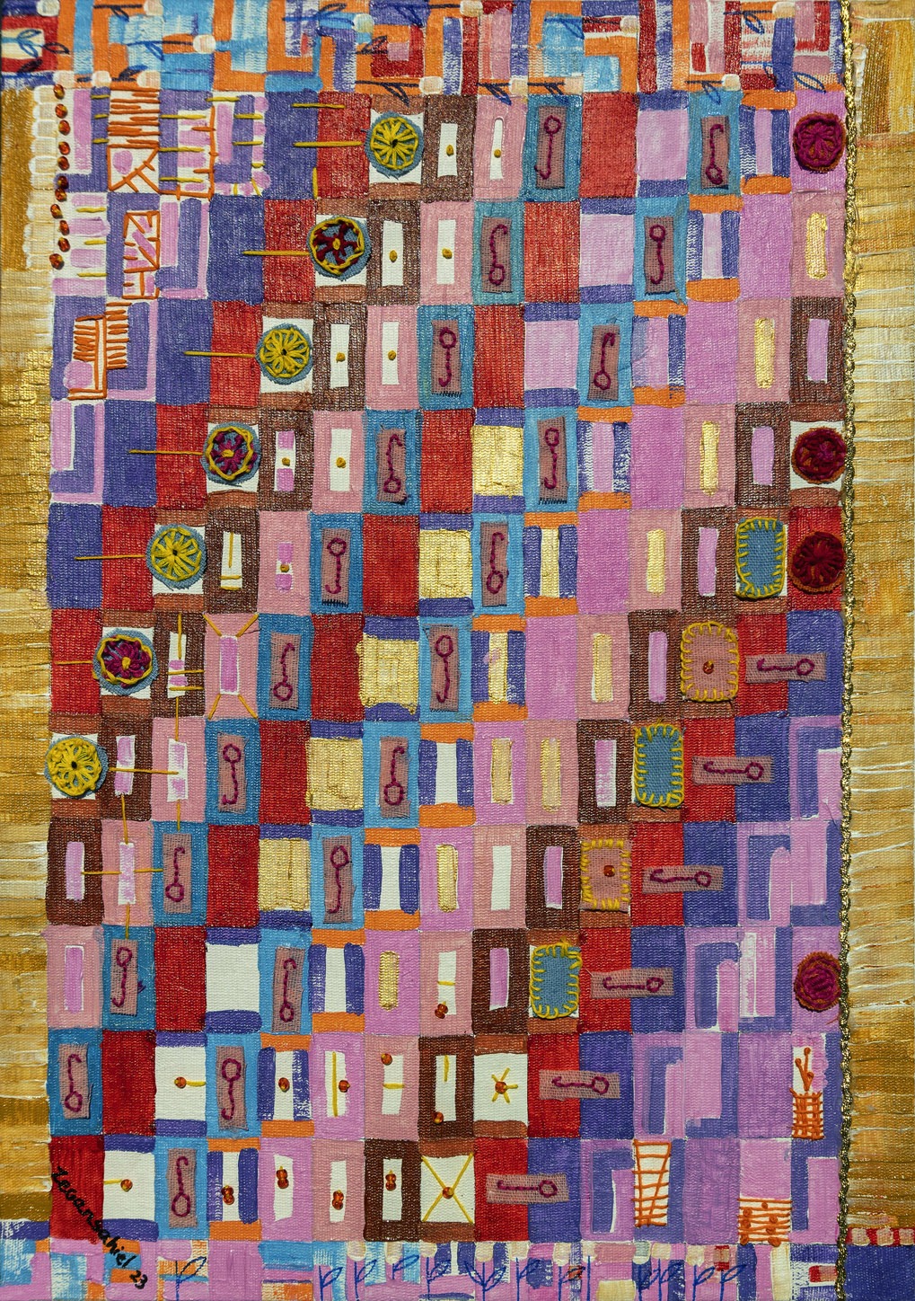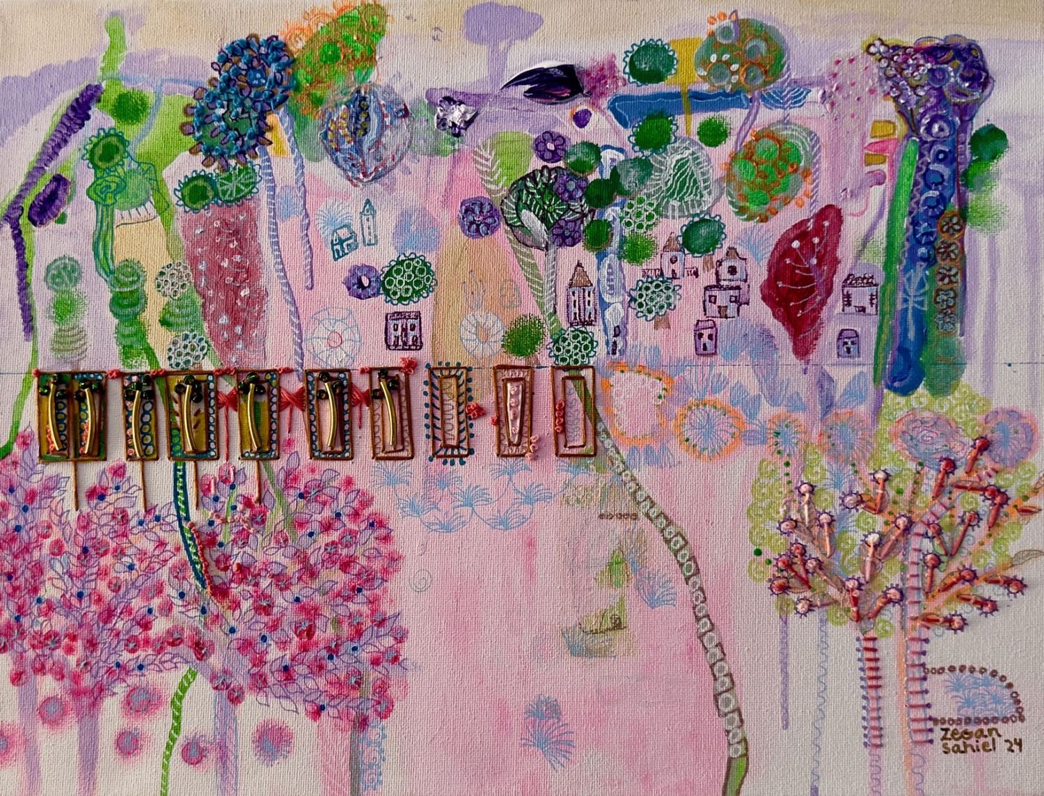 Yurién López Reyes is a multimedia artist from Trinidad, Cuba who paints under the professional name “zegansahiel”.  Working primarily in acrylic and gel pen canvases, her art often incorporates embroidery, hand stitch, fabric and beads, as well as other 3D elements and text to bring intriguing textural and material effects to the colour harmonies of her pieces.