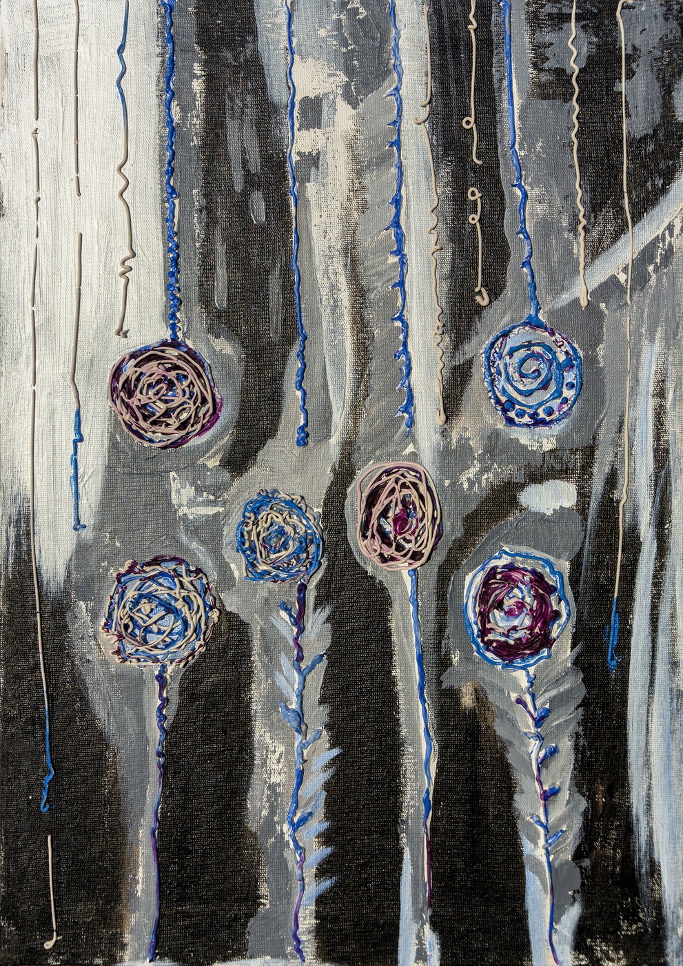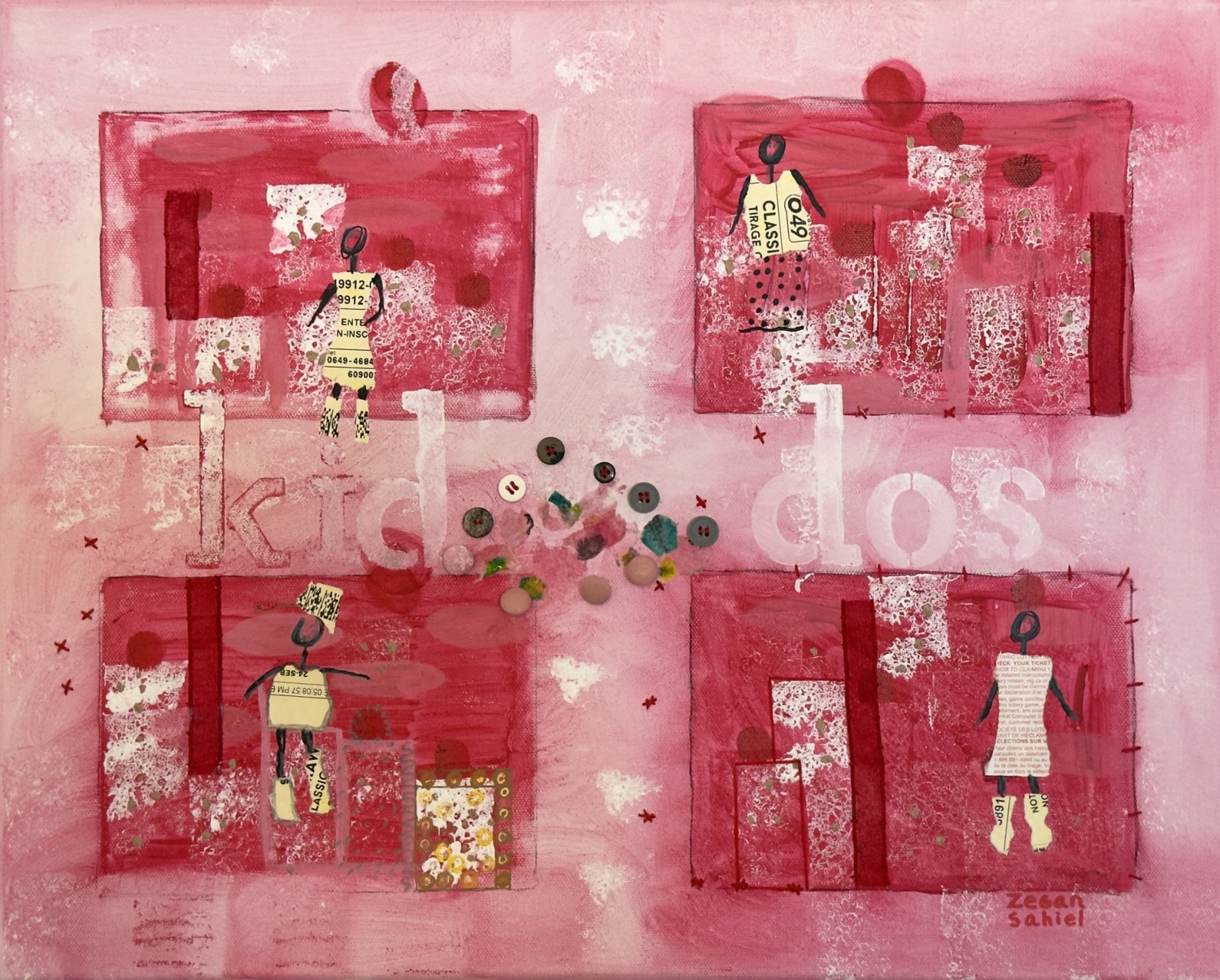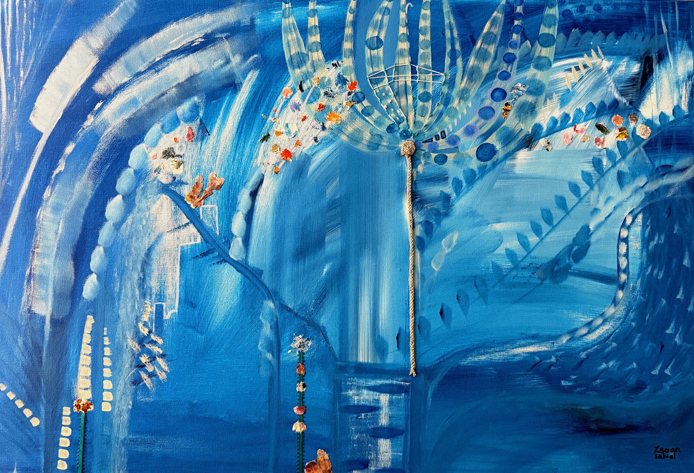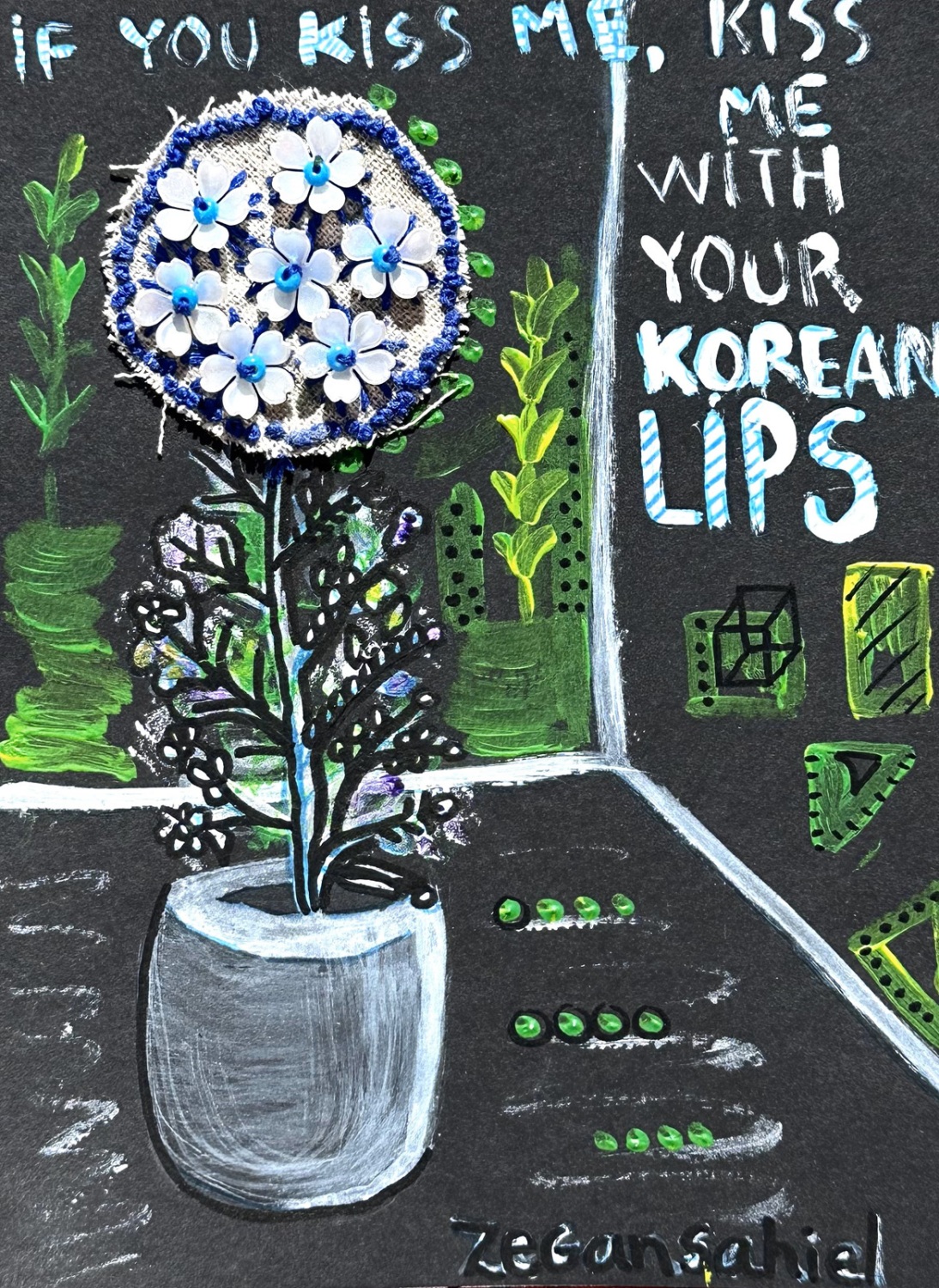 Yurién López Reyes is a multimedia artist from Trinidad, Cuba who paints under the professional name “zegansahiel”.  Working primarily in acrylic and gel pen canvases, her art often incorporates embroidery, hand stitch, fabric and beads, as well as other 3D elements and text to bring intriguing textural and material effects to the colour harmonies of her pieces.